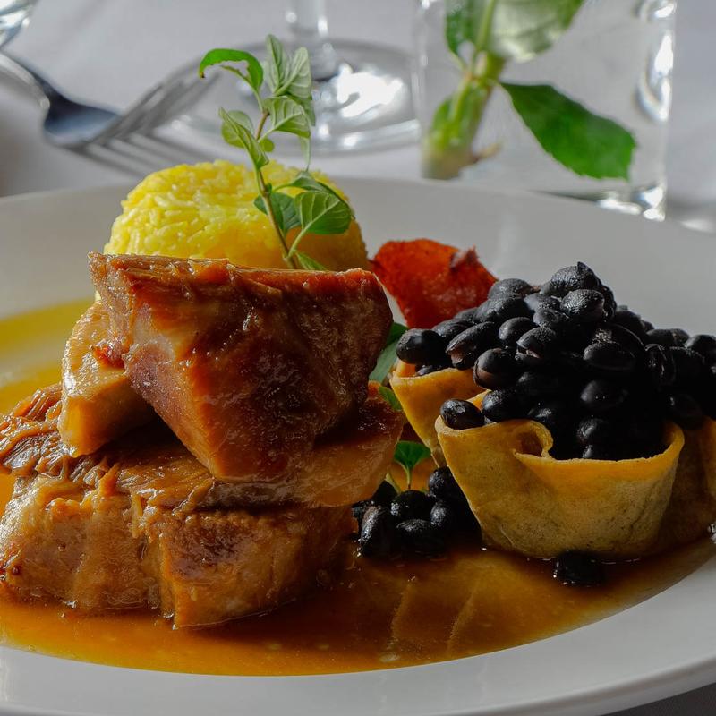Slow roasted Pork marinated in a blend of orange and garlic mojo then finished with fresh rosemary and served with white rice, black beans and sweet plantains.