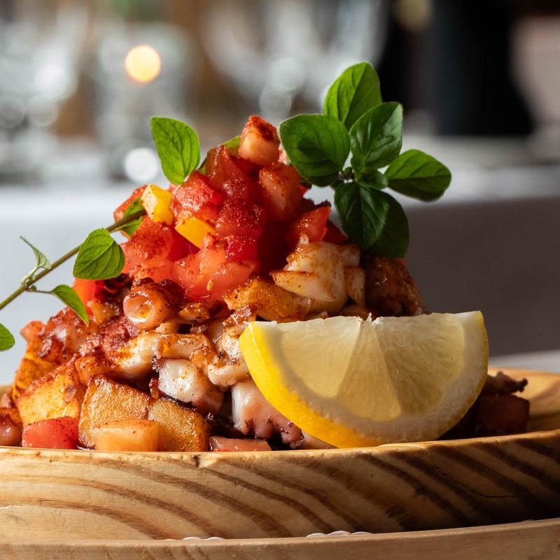 Tender octopus from La Caruna, Spain served with potatoes, sliced red onion, smoked sweet paprika, olive oil and chimol.