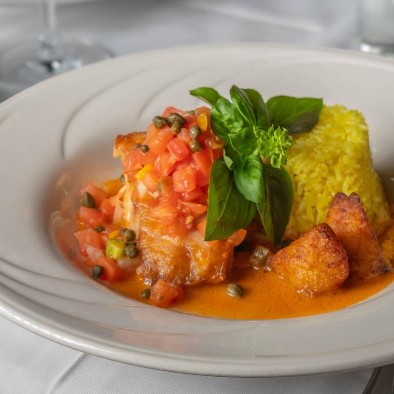 Tender fillet sautéed in olive oil, capers and chimol sauce. Served with white rice and sweet plantain.