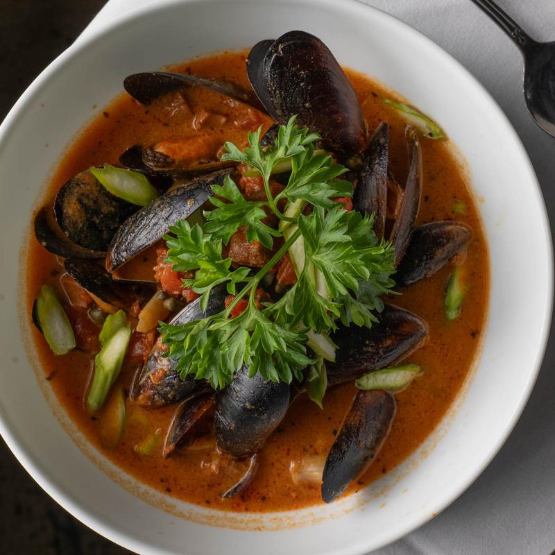 Mussels simmered along olives, capers and asparagus in a Flamenco tomato broth, served with Spanish chorizo.