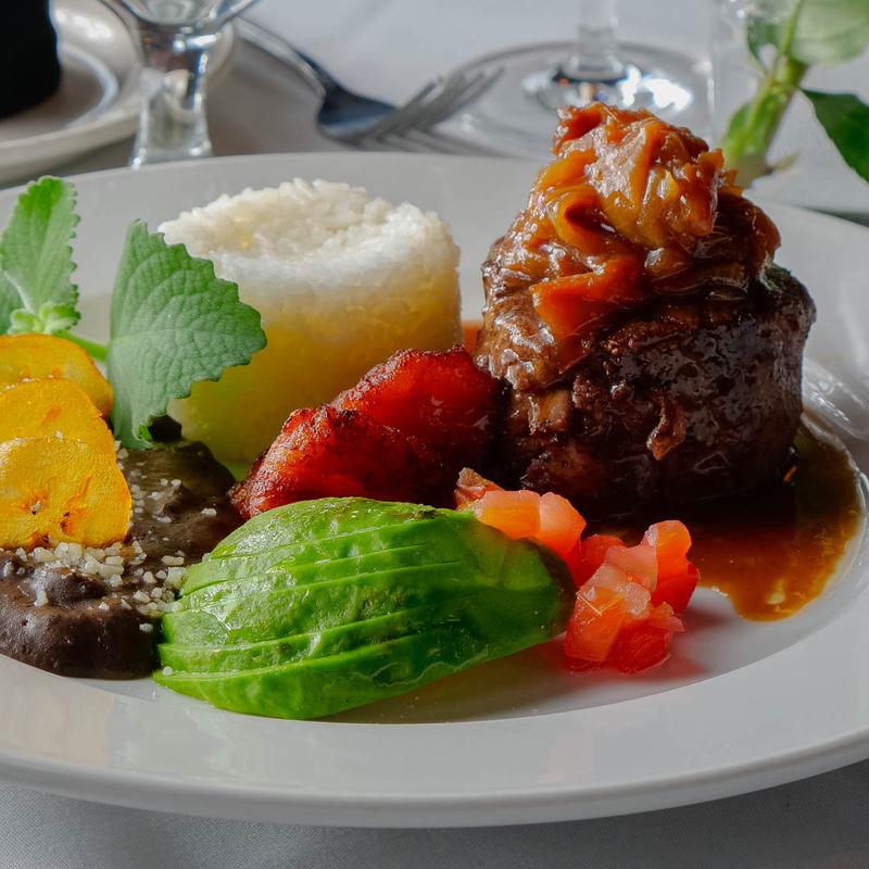 Certified Beef Tenderloin Filet served with caramelized onions, white rice, refried black beans, shredded cheese, avocado, chimol and sweet plantains.